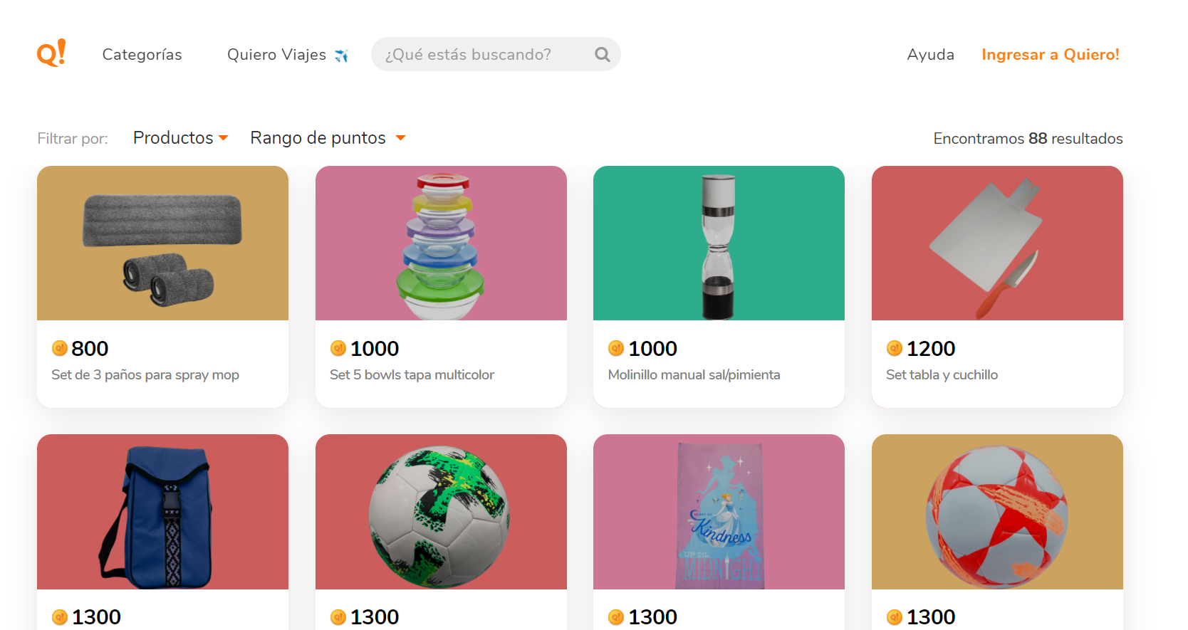 Somos proveedores del catálogo de premios Quiero! desde hace más de una década. Nos encargamos de la búsqueda, desarrollo y selección de productos, no solo para el catálogo sino también para promociones especiales como SOLO X HOY. Proveemos de productos nacionales, de Oriente y Licencias exclusivas.